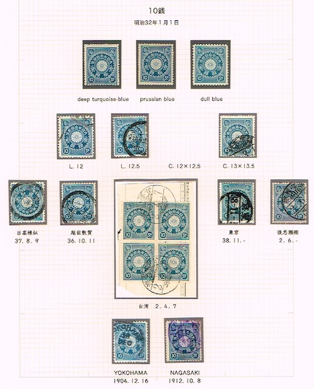 例えば、下のリーフは10銭切手ですが、2段目の右から2枚目の位置が空白になっています。