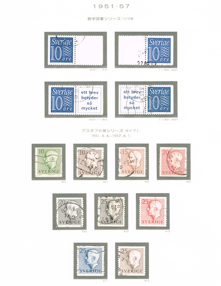 上半分が低額面の数字図案で、下半分がグスタフ6世シリーズのタイプ1。