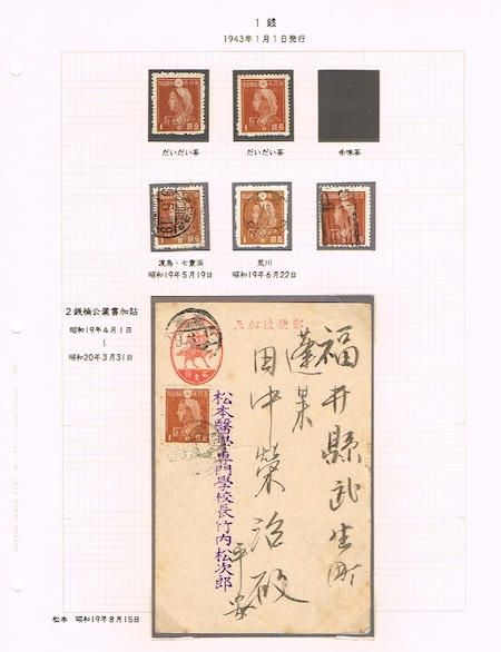 昭和切手のアルバムに綴じられた、第2次昭和切手1銭女工は3リーフ。