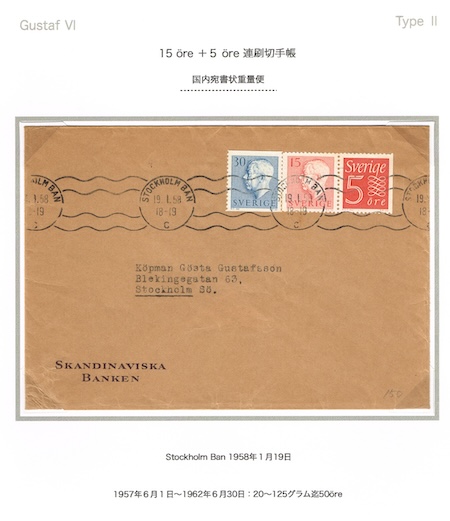 スウェーデンのグスタフ6世タイプ2の使用例で、北欧切手研究会の即売で100円で入手したもの。