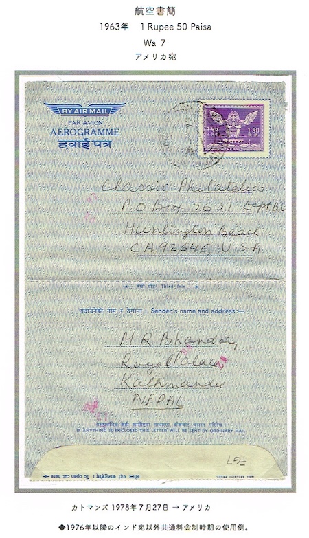 これは、カトマンズからアメリカに宛てられた使用例ですが、日付はずっと新しくなって1978年7月27日。
