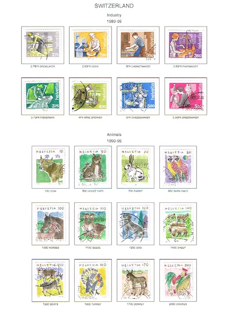 画像のリーフは、スイスの図入りアルバムに整理した2つの通常切手シリーズで、上の2段は1989年から発行が始まった「職業シリーズ」、下の3段は1990年からの「動物シリーズ」です。