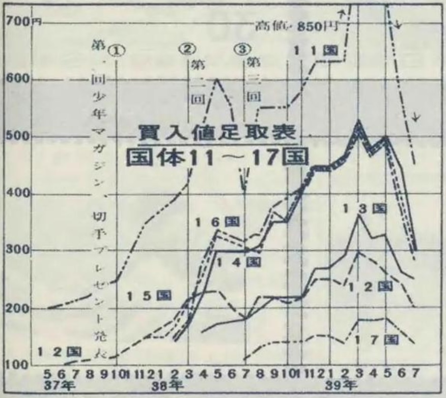 この企画は、初回が昭和37年10月、2回目が38年3月、3回目が38年7月で、それぞれの回と取引価格の変動を示して本文中で解説しています。